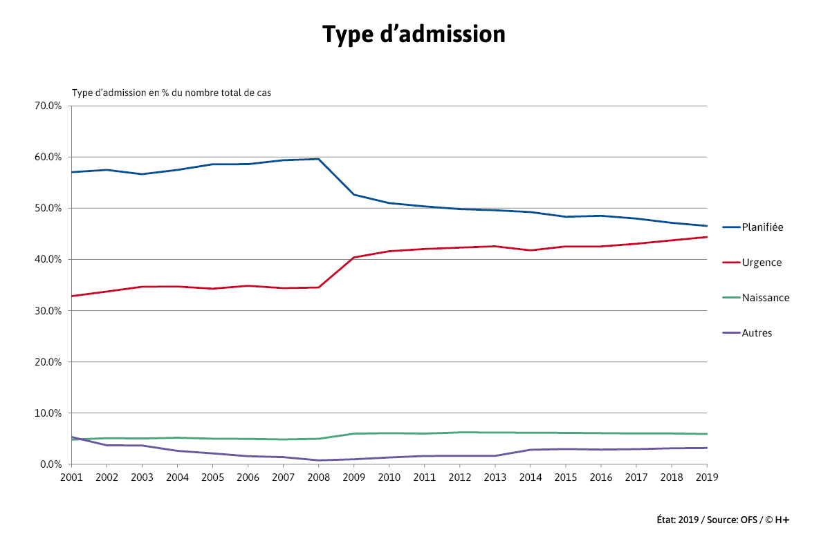 En 2019, 1,47 Mio de cas stationnaires ont été enregistrés. 46,5% concernaient des admissions planifiées et 44,5% des arrivées en urgence. Les deux types d’admission présentent des tendances inverses: Entre 2001 et 2019, les admissions en urgence ont augmenté de 11,5%, tandis que les entrées planifiées ont reculé de 10,5%.