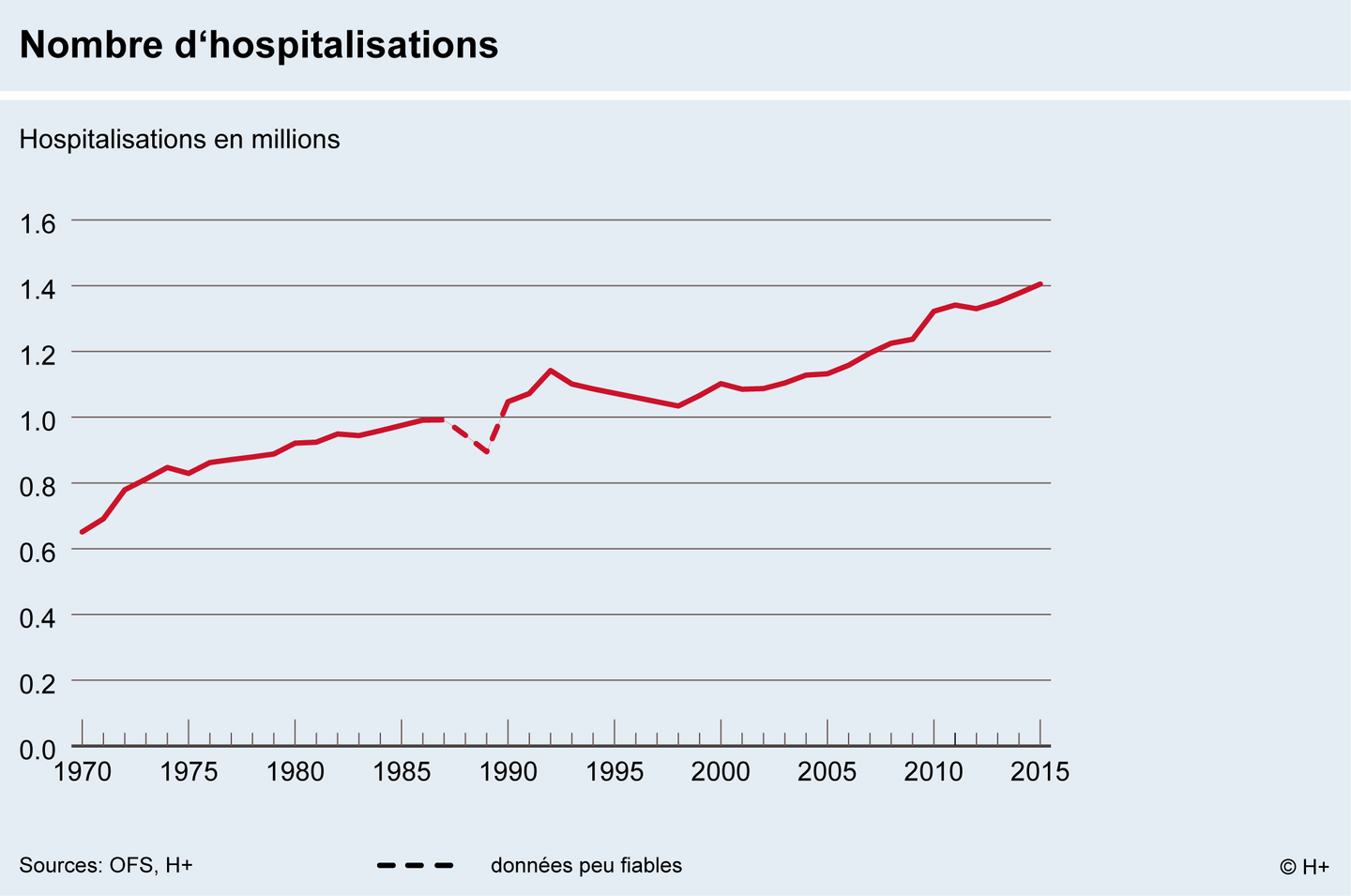 De 1970 à 2015, le nombre d’hospitalisations en Suisse est passé de 651’000 à 1,4 Mio: il a plus que doublé en 45 ans (+116%). Durant ces seules 14 dernières années (2001 à 2015), le nombre de cas a augmenté de 30%.