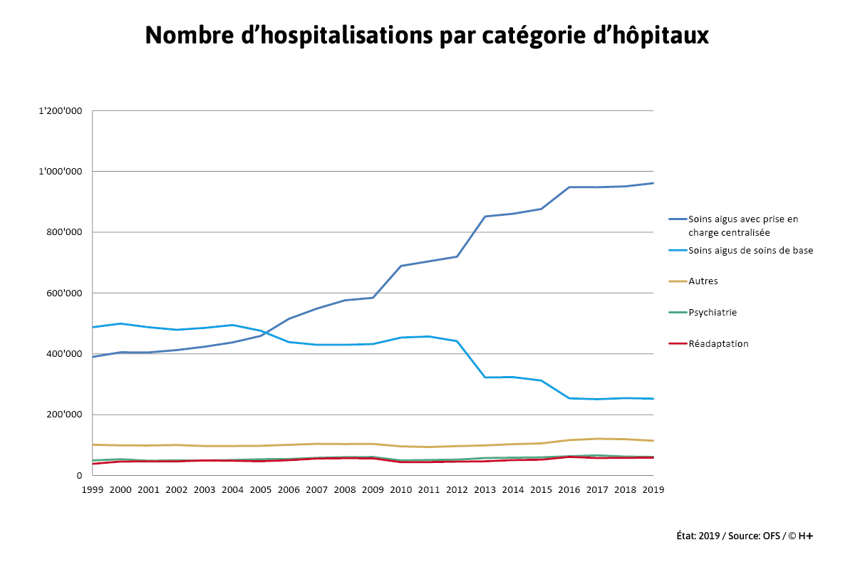 Les hôpitaux avec prise en charge centralisée avaient déjà détrôné les établissements de soins aigus de base en 2006. Depuis, ils ont enregistré une augmentation supplémentaire de leurs cas de 87%. Durant la même période, de 2006 à 2019, le nombre de cas traités par les établissements de soins de base a baissé de 42%. Les évolutions inverses des nombres d’hospitalisations correspondent à celles de leurs structures (voir Catégories d’hôpitaux). Elles résultent notamment des regroupements (fusions, créations de groupements d’hôpitaux), au cours desquels des hôpitaux de soins de base sont devenus des hôpitaux avec prise en charge centralisée.