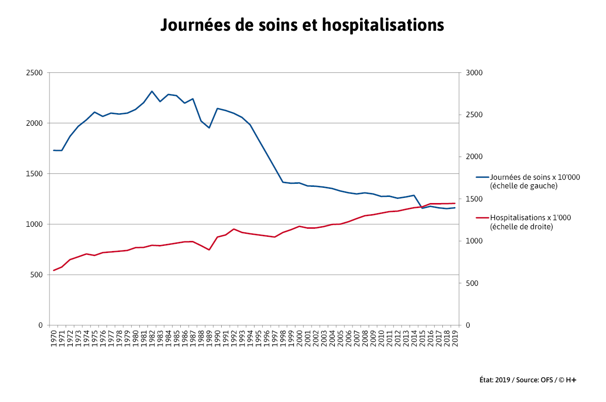 Pour des raisons de lisibilité, l’échelle des journées de soins est exprimée en dizaines de milliers et celle des hospitalisations en milliers. Les données des années 90 ne reflètent qu’approximativement la réalité, car les bases de données n’étaient pas bonnes à cette époque. À partir de 2015, le jour de sortie n’est plus comptabilisé dans la statistique de l’OFS, ce qui se répercute dans le graphique.