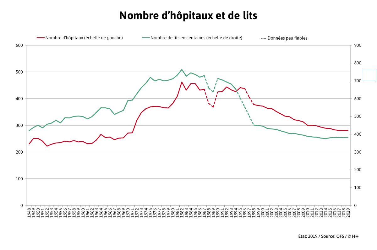 - La phase de redimensionnement a suivi dès les années 1980 et elle se poursuit aujourd’hui. En 2019, la Suisse comptait encore 281 hôpitaux et environ 38’000 lits. Cela représente une réduction par rapport à l’année record de 1982 de 39% pour les hôpitaux et de 50% pour les lits.