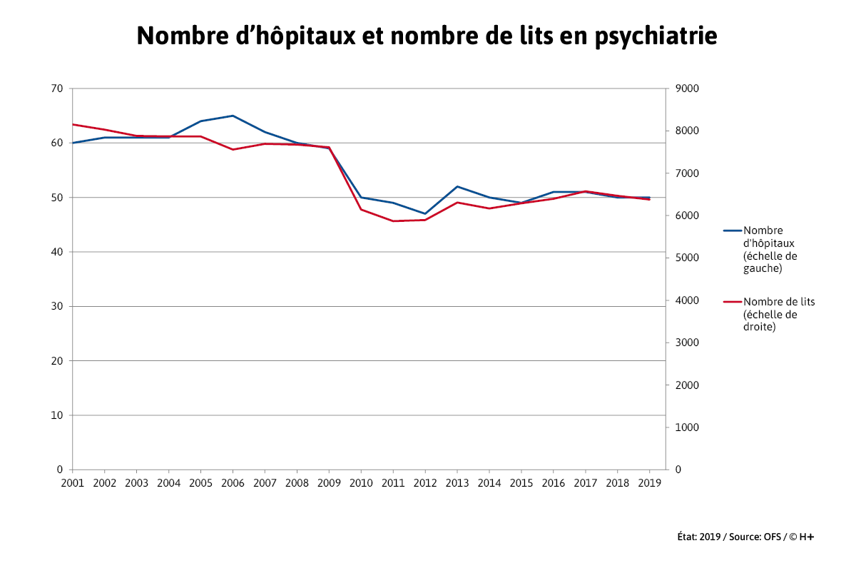 Dans le domaine de la psychiatrie stationnaire, le nombre d’institutions a augmenté entre 2001 et 2006, passant de 60 à 65. En revanche, de 2006 à 2012, la statistique enregistre une baisse de 65 à 47. En 2019, on dénombrait 50 institutions. Le nombre de lits en psychiatrie est quant à lui passé de 8’152 à 5'868 entre 2001 et 2011, mais en 2019, il est remonté à 6'378. Il en résulte en définitive un recul de dix institutions (-17%), resp. 1’774 lits (-22%).