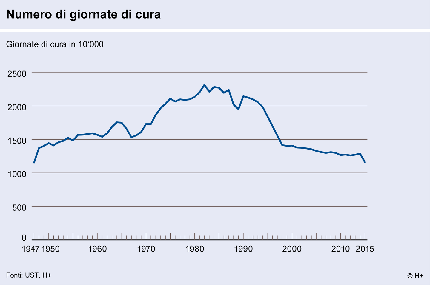 Lo sviluppo delle giornate di cura dalla fine della seconda guerra mondiale può essere descritto come segue: in un lasso di tempo di circa trent'anni il numero di giornate di cura tra il 1947 e il 1982 è costantemente aumentato e raddoppiato, da 11,6 milioni a 23,2 milioni. Alla fase di crescita è seguita una fase circa trentennale di riduzione. Fino al 2015, con 11,6 milioni di giornate di cura, il numero è praticamente sceso al livello dall’inzio degli anni quaranta. Ciò corrisponde a una riduzione del 50% rispetto al 1982.