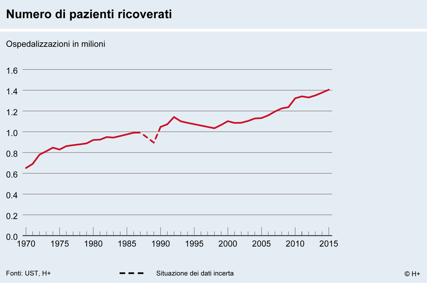 Tra il 1970 e il 2015 il numero di pazienti ricoverati in Svizzera è cresciuto da 651'000 a 1,4 milioni. Ciò significa che è più che raddoppiato in 45 anni (+116%). Già solo negli ultimi 14 anni, dal 2001 al 2015, le cifre per caso hanno registrato un incremento di 30%.