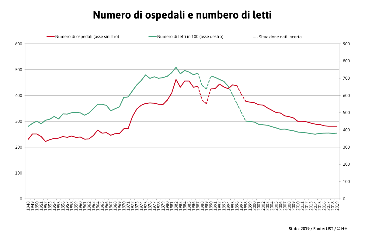 - La fase di ridimensionamento è iniziata nei primi anni Ottanta ed è tuttora in corso. Nel 2019 la Svizzera contava ancora 281 ospedali e circa 38’000 letti. Ciò significa una riduzione a livello assoluto del 39% per quanto riguarda gli ospedali e del 50% per i letti, rispetto al culmine del 1982.