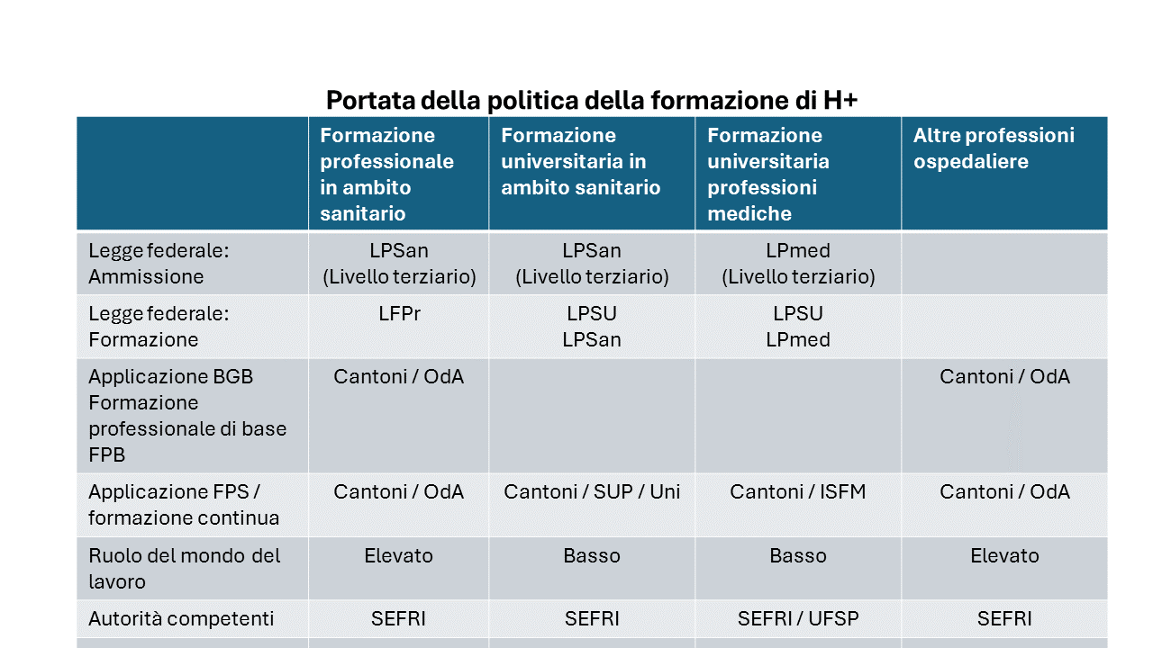 H+ rappresenta gli interessi di ospedali e cliniche nel settore della formazione con l’obiettivo di assumere un ruolo dirigenziale per le questioni inerenti alla formazione del sistema sanitario. In tale contesto H+ pone gli accenti su formazione di base e continua nelle professioni mediche, sanitarie e in particolare infermieristiche. Pure altre professioni non sanitarie, circa un quarto del personale, sono tuttavia fortemente rappresentate negli ospedali e sono irrinunciabili per il funzionamento di un ospedale (ad es. professioni in ambito commerciale, professioni del settore economia domestica/servizio alberghiero, sicurezza o tecnica). Per questo motivo H+ apporta gli interessi dei propri membri pure in questi campi professionali.